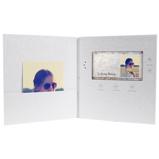The Video Book is a modern way for your family to share the tribute video of your loved one. When you open up the Video Book, the tribute video automatically starts playing on a crystal-clear 7-inch HD screen. It has touch responsive buttons for volume, play and pause, and skipping forwards and backwards. It also comes with a pocket for you to keep photos, funeral programs, and other keepsakes in. The Video Book battery lasts for two full hours and can be recharged with a mini-USB cable.